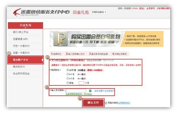 登录需要开通会员的迅雷账号=》选择左侧的【雷点账户支付】方式=》选择【开通时长】=》