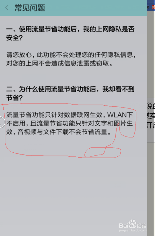 我们先来看看它的帮助,流量节省,只对数据,也就是我们所说的2g 3g 4g网络数据流量 有效果,同时,这里还说,只针对图片和文字。其实,节省流量,就是压缩了图片和文字的的大小。懂了原理之后,我们就可以开启了。