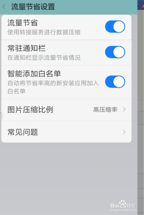 这里 回到上面的流量节省主界面。点右上角的设置按钮,可以进入设置界面。