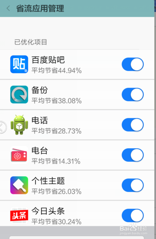 在看店面的图,点击流量节省,进入到流量节省的设置界面。点击省流量应用管理,这里,它默认是自动优化的,也就是说,流量大的软件,会自动的为我们设置节省流量,不需要我们自己手动设置。还是很人性化的。