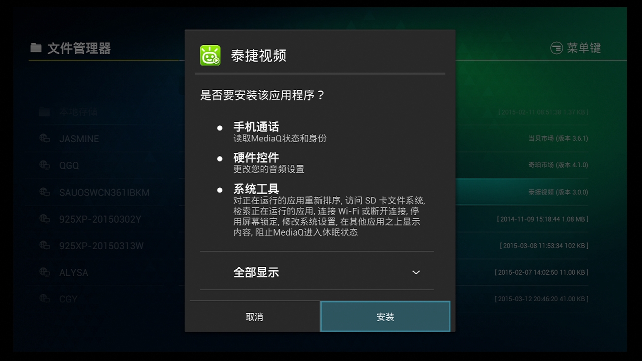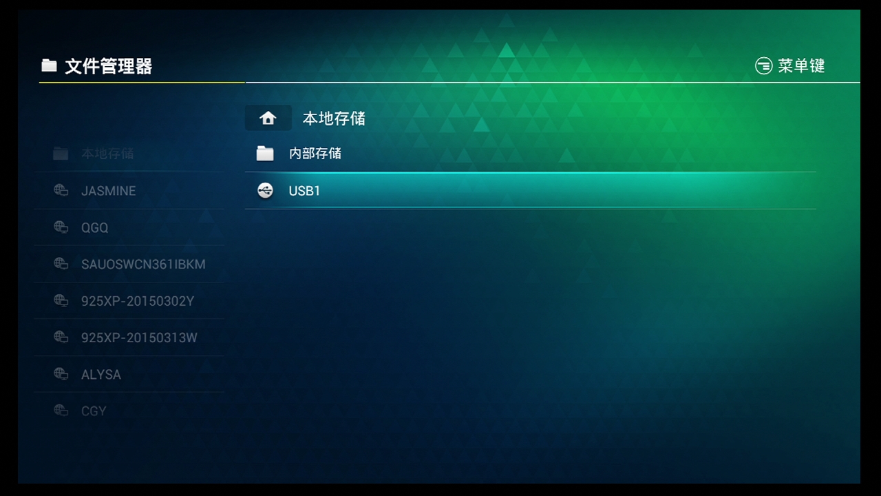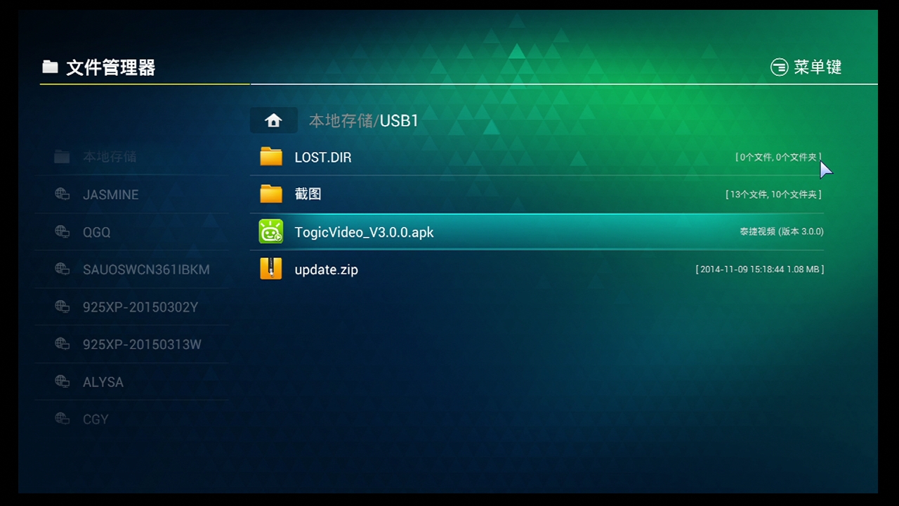 4、打开“USB1”找捷视频APK的存放位置。打开,并根据提示完成安装。