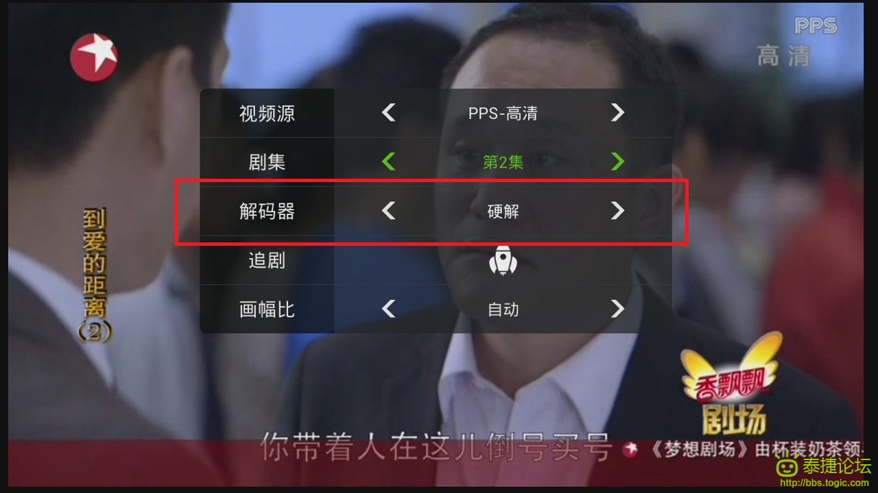进入直播界面,遥控器按“菜单键”调出菜单,然后选择解码器,遥控器左右键切换即可。