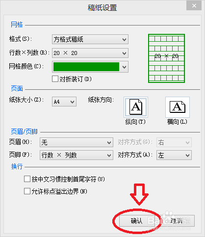 弹出“稿纸设置”对话框。在这里,可以设置稿纸的格式、行数、列数、颜色等。