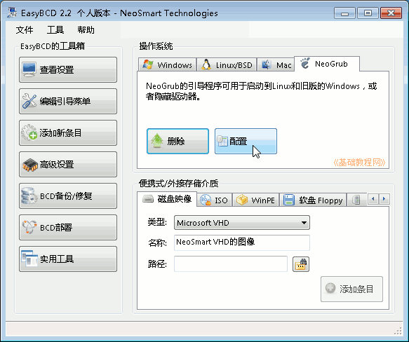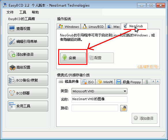 然后在右侧出来一个面板,点最右边的“NeoGrub”标签,再点它下边的“安装”按钮;