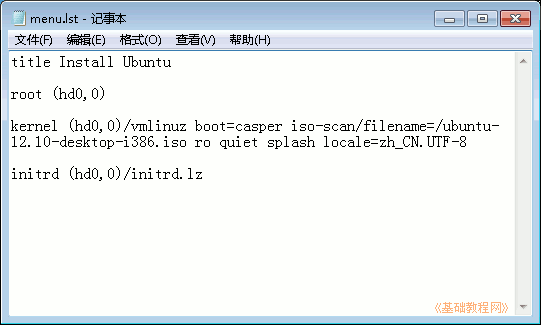如果系统中有100M保留分区,要将第二句改成 (hd0,1),检查的方法请参阅 基础1课程,第三句里红色的文件名处,也要改成自己下载的镜像文件名;