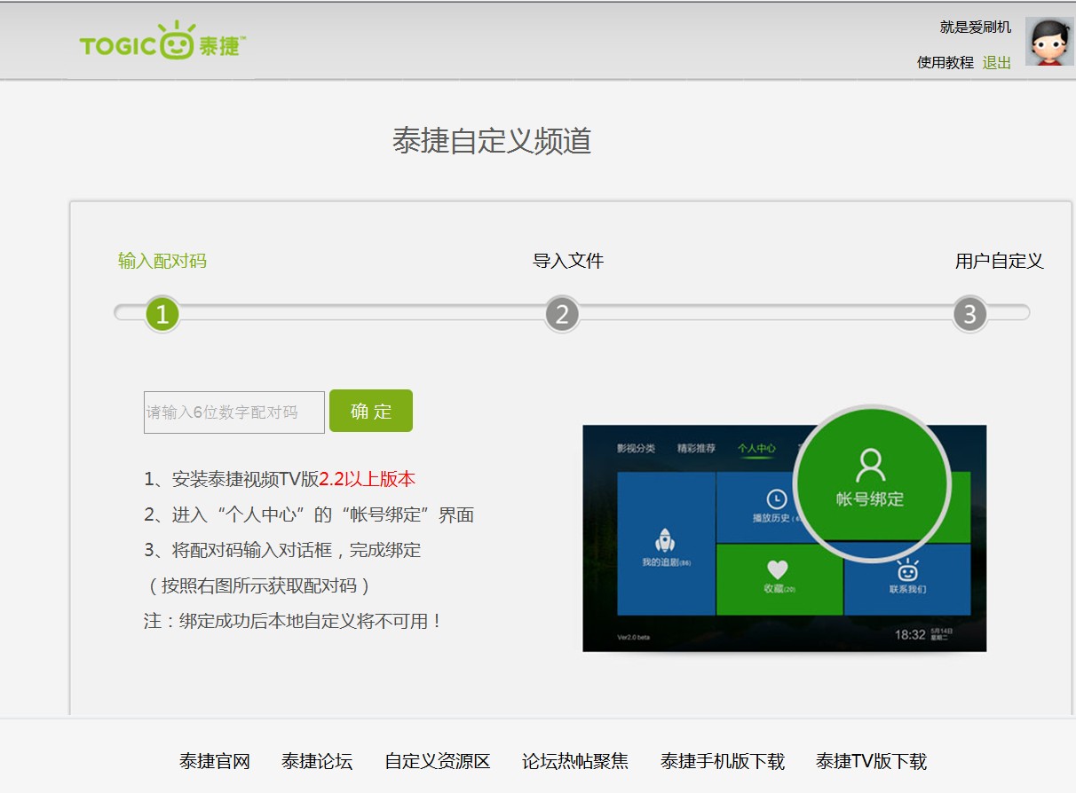 以在设备(电视或者盒子)终端打开泰捷视频,找到“设置”选项,选择“账号绑定”后可看到6个数字的配对码。(注意:配对码需要在300秒的失效内输入,否则绑定不成功)