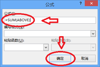 在弹出的“公式”对话框中,默认即为“将上述数据求和”命令(SUM(ABOVE))。如果不是这个命令,则在“=”后输入该命令,或者单击“粘贴函数”菜单中的“SUM”选项并在括号中输入“ABOVE”。输入完毕,单击“确定”按钮。