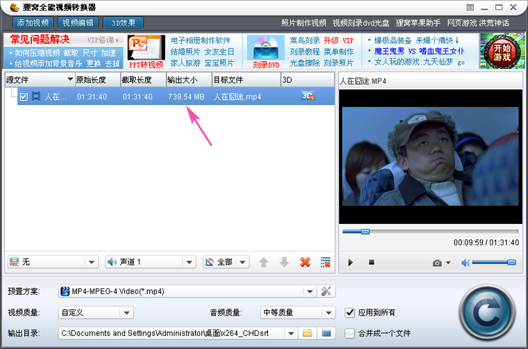 我们先试着选择比特率1000,然后确定回到视频压缩软件主界面“输出大小”是多少?