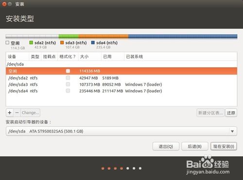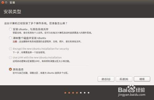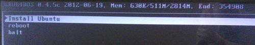 1重启电脑,可以看到多了一个启动项“NeoGrub引导加载器”,选择该项enter,然后选择“install ubuntu”,另外两项分别是“重启”和“关机”,是为了防止安装出错而设的,这个在之前的menu.lst配置文件中已经设定好了。