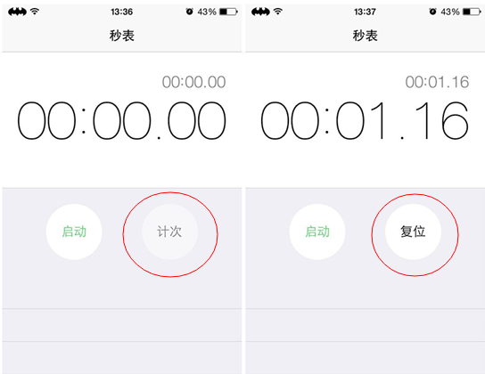 启动按钮用于用户启动和停止秒表,其右侧的计次按钮可记录每一圈时间,也可以后来复位秒表。