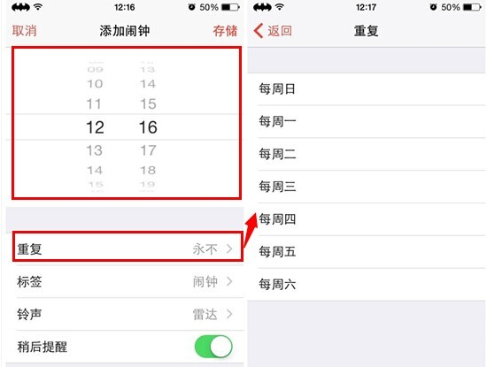 通过点击右上角的“加号”按钮可以添加闹钟。使用滚轮设置完闹钟响起的具体时间后,可在“重复”选项中设置闹钟生效的日期,只需在相应周目选项后打上勾就可以了。