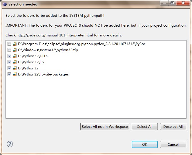 点击OK后跳出一个有很多复选框的窗口,选择需要加入SYSTEM pythonpath的选项,点击Ok。