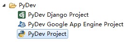 在 Eclipse 菜单栏中,选择File > New > Pydev > Project…,在窗口中选择PyDev Project,有三种项目可以创建,选择PyDev Project。