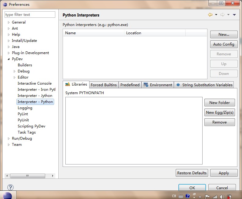 PyDev安装好之后,需要配置解释器。在 Eclipse 菜单栏中,选择Window > Preferences > Pydev > Interpreter – Python,在此配置 Python。首先需要添加已安装的解释器。如果没有下载安装Python,请到官网下载2.x或者3.x版本:http://www.python.org/。