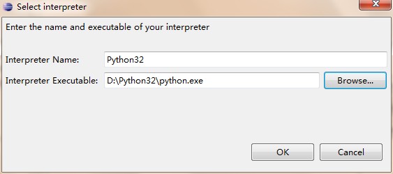 我使用的是Python3.x版本,Python安装在D:\Python32 路径下。单击 New,进入对话框。Interpreter Name可以随便命名,Interpreter Executable选择Python解释器python.exe。