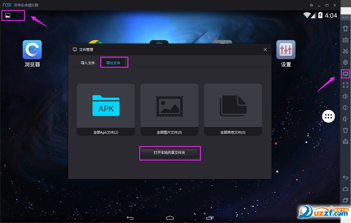 ②然后我们打开模拟器右侧的我的电脑按钮,导出文件-打开本地共享文件夹。