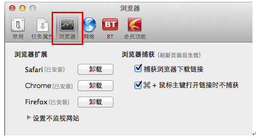 2、 在弹出的设置界面中选择浏览器。进行相对应浏览器安装,并勾选捕获浏览器下载链接