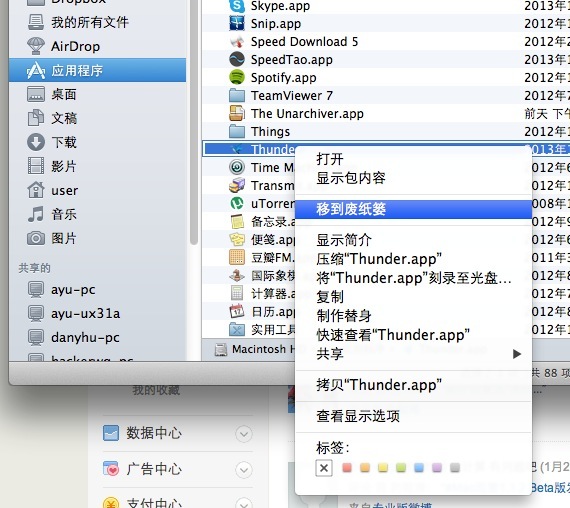 进入Finder,打开应用程序,右键thunder.app,选择移到废纸篓即可。如图:
