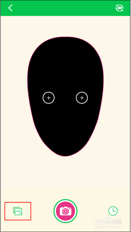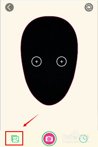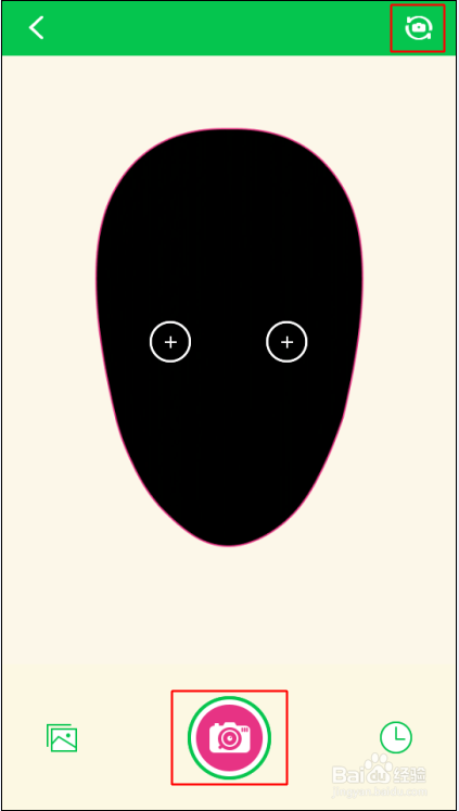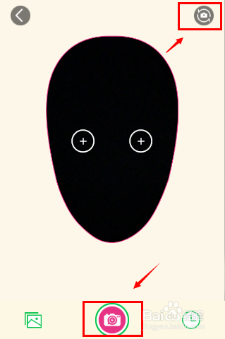 点击Mojime单人动态表情进入制作界面,在这里可以看到一个人头的形状,而且MojiMe默认开启手机的前置摄像头,方便我们自己拍照,点击右上角切换摄像头按钮,切换到后置摄像头给好友拍照,点击中间的照相机图标即可以拍照,如下图所示。