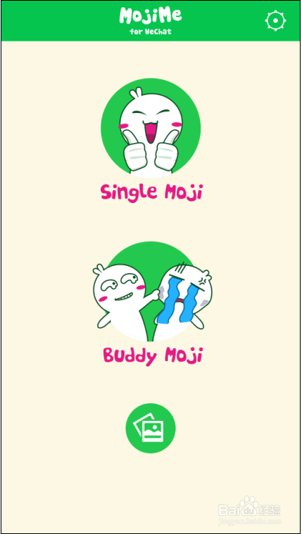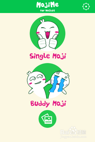 首先下载微信的 MojiMe 到手机,安装完成后,在手机中打开 MojiMe ,在主界面上第一个选项是制作单人动画表情,第二个选项是制作 双人动画表情 ,这里先来试一下单人的。