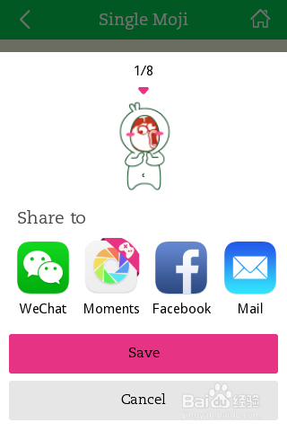 选择喜欢的表情后,此时会弹出一个新页面,然后点击微信图标,如果想分享到微信,那么可以点击Save进行保存,点击Cancel可以取消保存。