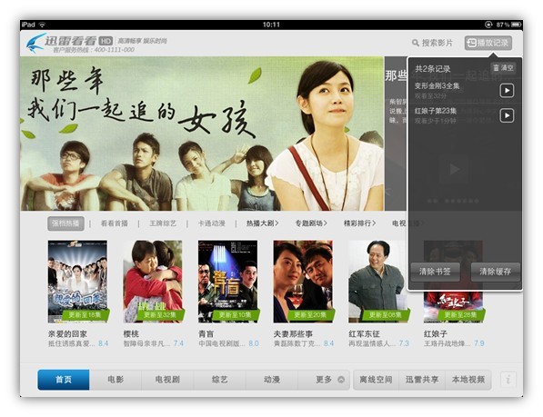 1、播放记录与清空:迅雷看看HD在线播放过的视频,都将会记录在内;若影片未观看完整, 将会记录最后播放时间,方便下次续播未看完片段;若清空记录后, 所记录的播放过的影片以及影片的最后播放时间都将消去。