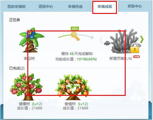 在您完成一个幸福树的成长后,系统将解锁其他的幸福树,您可以选取新的幸福树继续种植。