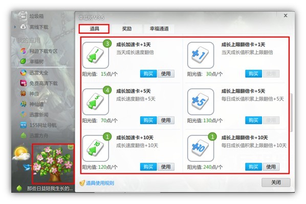 可以通过迅雷7主界面左下角点击自己的幸福树,在弹出的窗口中进入道具栏内,使用阳光值购买所需要的道具即可