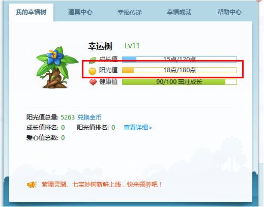 注:这里每天统计的成长值、阳光值,每天晚上0点会自动刷新,会加到如下图位置里面。