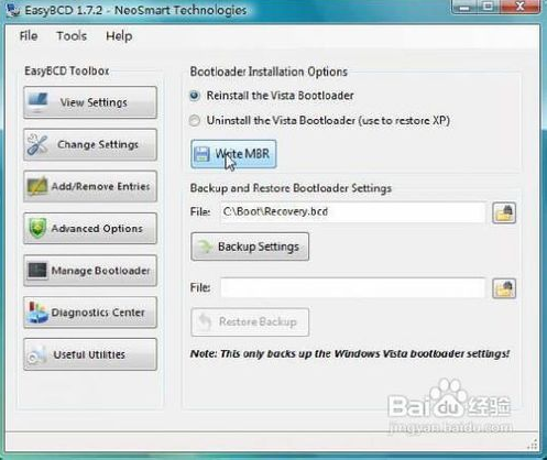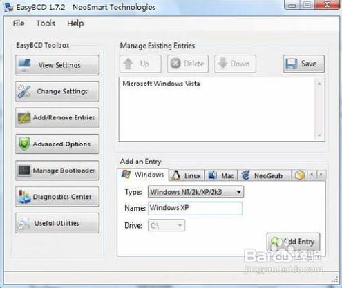 2、此类故障是典型的Windows XP/Vista双启动故障,可以通过EasyBcd软件进行修复