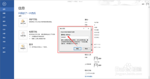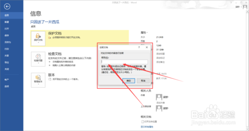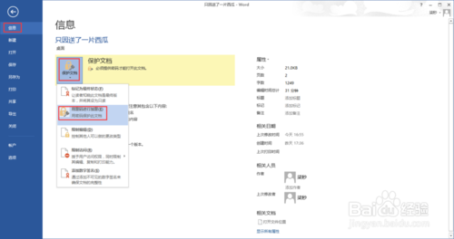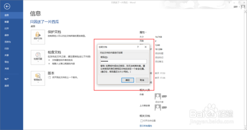 单击“文件”按钮,选择“信息”,保护文档-用密码进行加密。