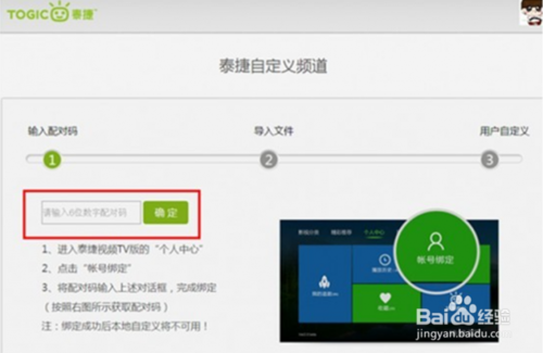 打开泰捷视频软件,选择 “个人中心”中的“账号绑定”,“ok键”确认。将下图中间的6位数字配对码输入电脑端的对话框中,然后点击确定进行绑定。