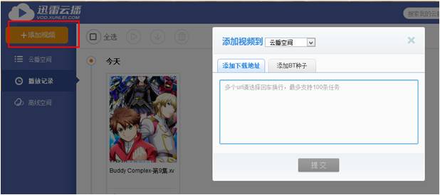 进入迅雷云播页面>>,在任务列表页,点击顶栏右侧的 “添加任务” 按钮,提交视频下载链接/BT种子,建立播放任务;