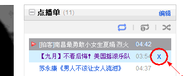 如下图,可以在点播单开始播放后,点击播放列表视频标题右侧的“X”按钮来移除点播单中的视频。