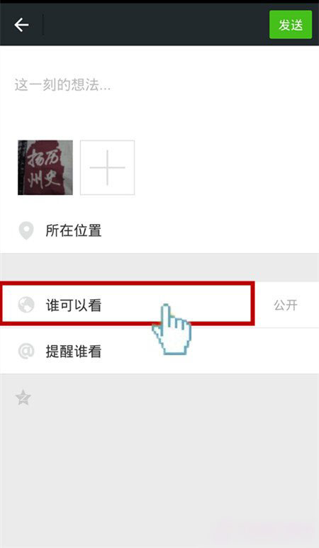 6、微信内容编辑中,我们可以输入自己的话,输入完后,注意下面多了一个“谁可以看”,点击进入。