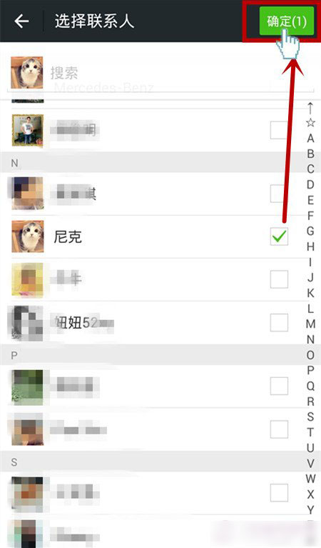 8、微信系统会跳转到“选择联系人”界面,我们进行勾选“联系人”,可以多个挑选,再点击“确定”,如图。