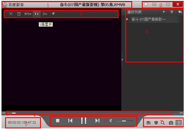 6:主控制按钮区域:包括播放/暂停、停止、上一个文件、下一个文件、音量控制等最常用的功能按钮。