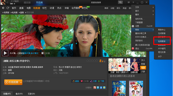 1、请您先点击PPTV网络电视 主界面右上角的“菜单--帮助—检测更新”
