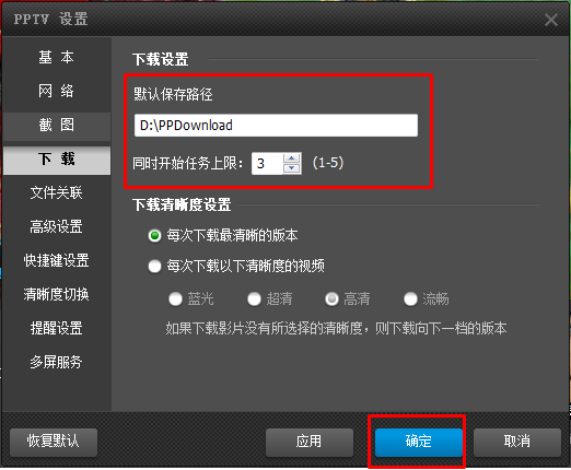 6、您可以在设置中修改下载相关的选项,重新指定默认保存路径;同时下载的任务上限默认为3个,最多允许5个。