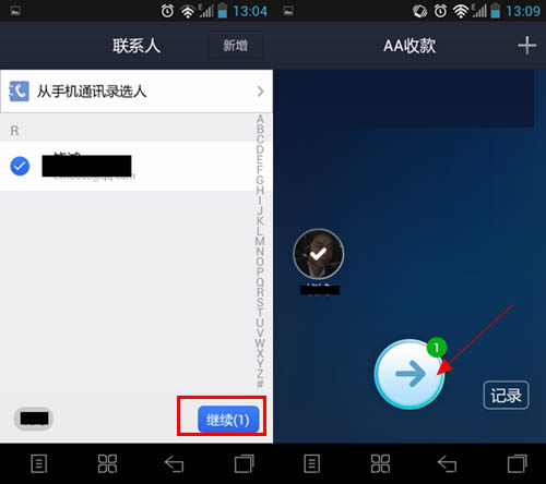 3、当添加完AA人员之后,需要点击需要AA付款人员的头像,然后点击【—>】箭头按钮即可。如下图所示: