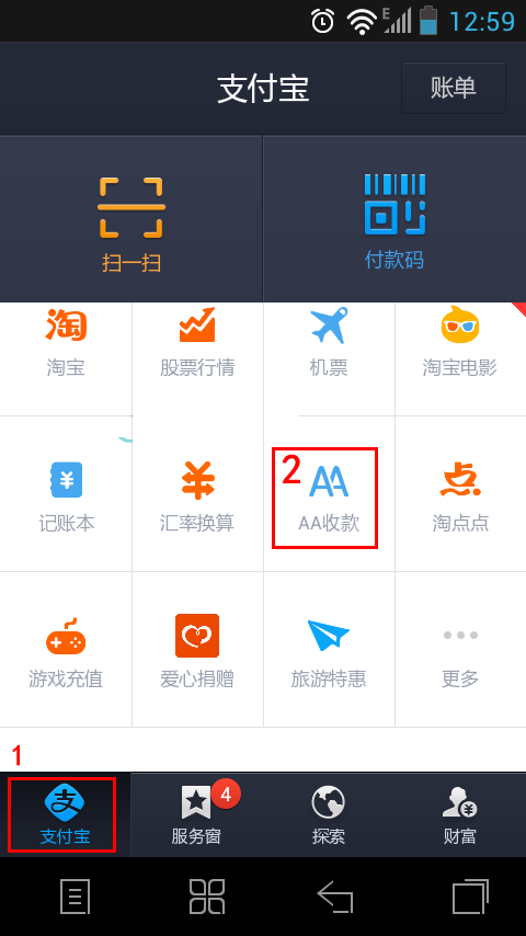 1、打开支付宝钱包,在【支付宝】图标下方就可以看到AA付款图标,再点击【AA付款】进入AA付款界面,如下图所示: