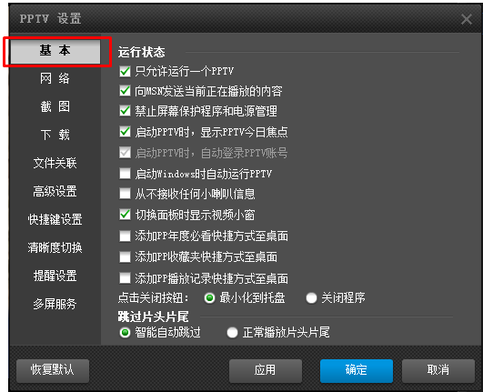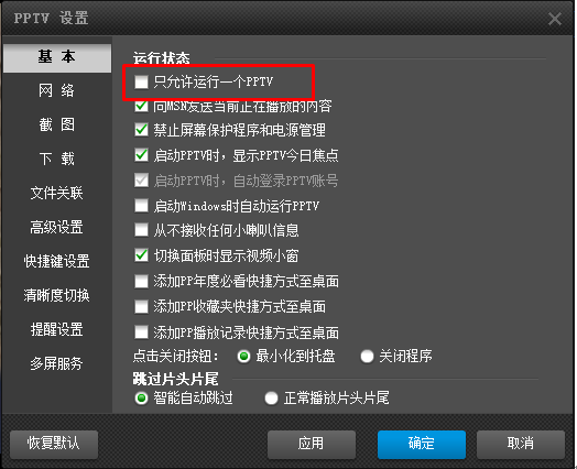 2、去掉“只允许运行一个PPTV”前面的勾选