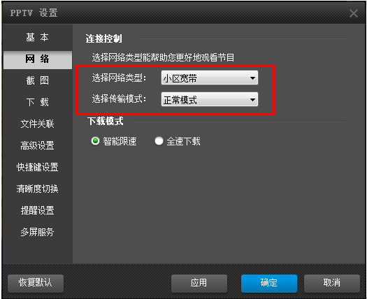 1、在PPTV网络电视主界面中打开“菜单—设置—网络”。