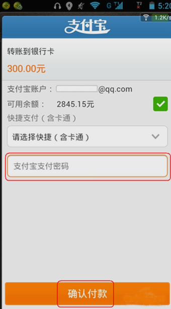 输入支付宝支付密码即可,如果支付宝余额不足的,可以选择使用快捷支付里的“卡通”(事先需要绑定银行卡)。