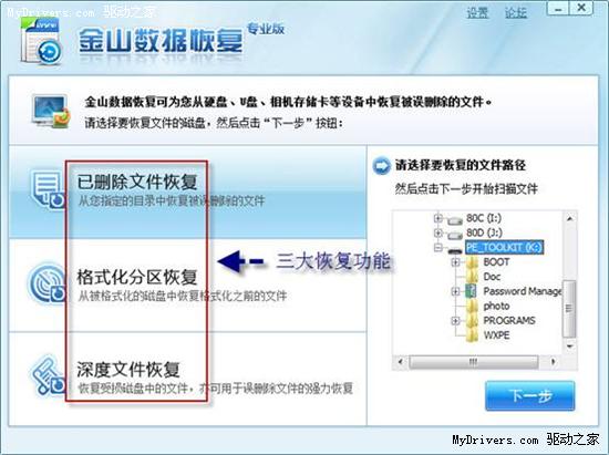 三:在此小编要说的是“金山毒霸数据恢复”工具包括了“已删除文件恢复”、“格式化分区恢复”“深度文件恢复”三大恢复功能,功能划分简单,而且各功能都有对应的说明,即使是计算机菜鸟也能快速上手。