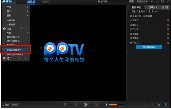 3、双击“PPTV 网络电视”,弹出节目库,点击左上角“主菜单”按钮,选择“切换到经典模式”即可完成时尚到经典播放模式的切换