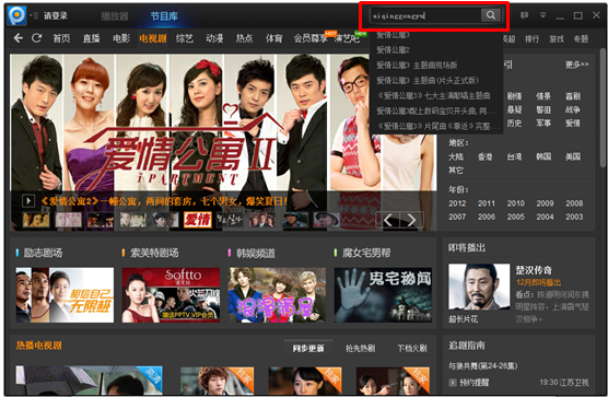 比如您想看《爱情公寓》,但是您不知道这部电影是什么类型的片子,所以在现有的节目分类中您无法逐步查找这部片子,那么您可以直接在软件界面“视频”列表上方的“搜索栏”内输入您想查询的关键词(如:爱情公寓),会有关键词提示单供您选择合适的搜索关键词