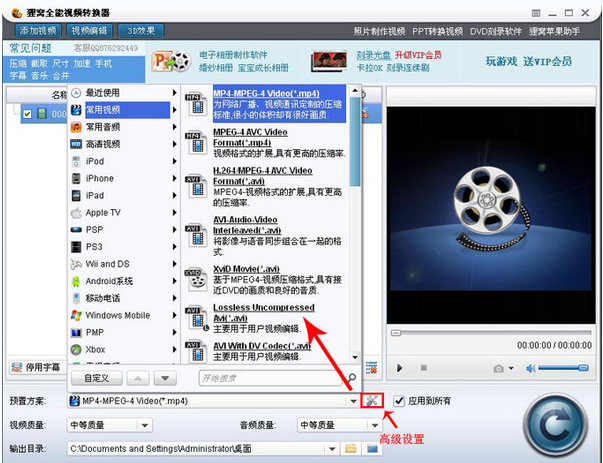 三、设置完成之后,就可以对文件的输出格式进行设置,狸窝的多种预置格式几乎能满足所有的转换要求,在狸窝全能视频转换器的高级设置里面还可以对视频的尺寸及比特率等进行自定义设置。