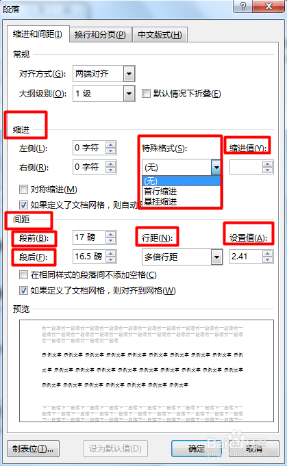在弹出的界面里头,可以设置缩进的格式、间距、间距值等。如图所示。