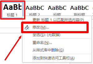 打卡Word2013文档,在你需要修改的标题里头,对着该标题右键,点击“修改”。如图所示。